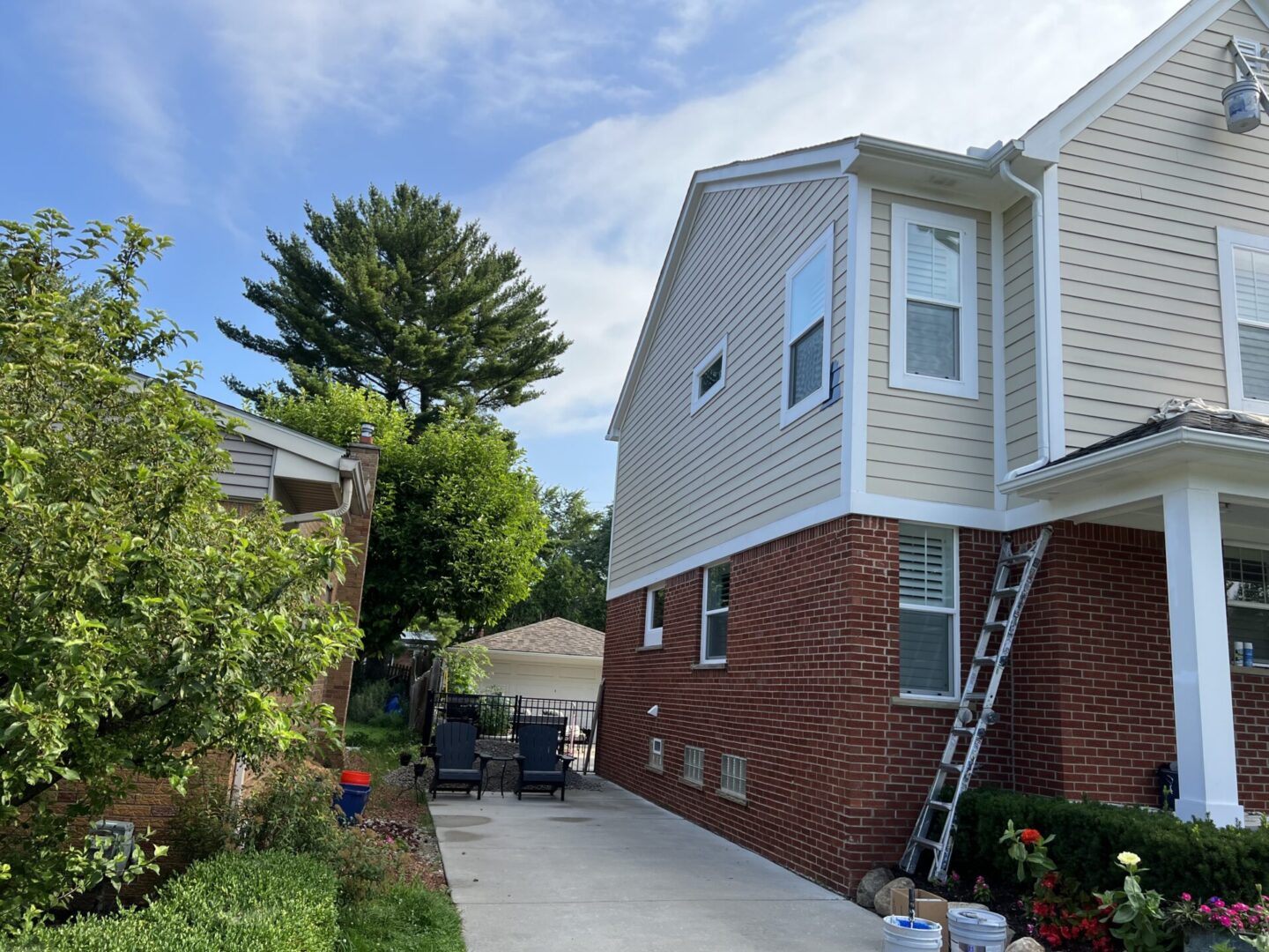 Side view of a two-story house with a brick base and beige siding under a clear sky.