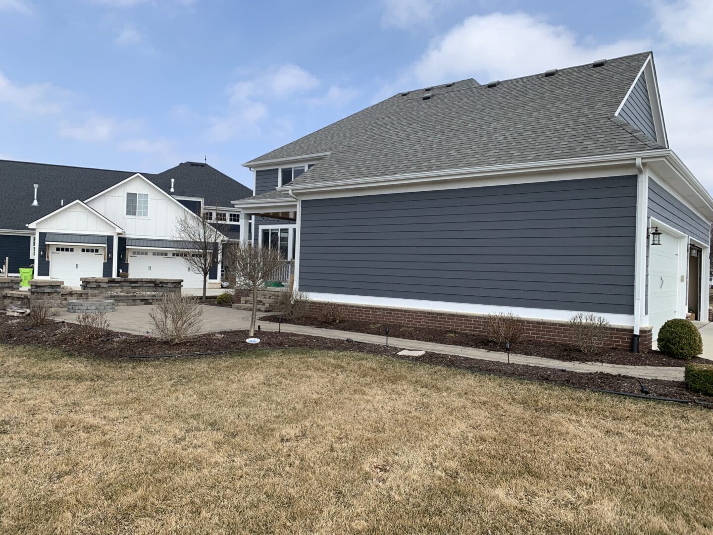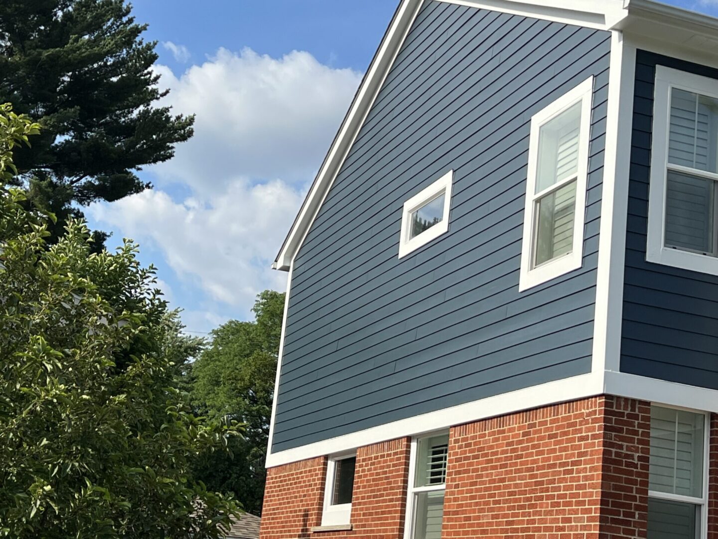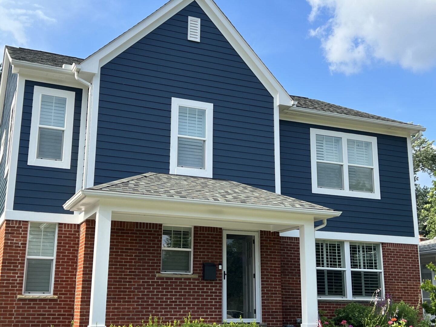 A two-story house with navy blue siding and red brick accents.