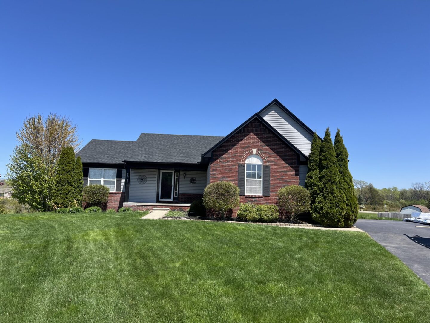 A single-story brick and siding house with a manicured lawn under a clear blue sky.