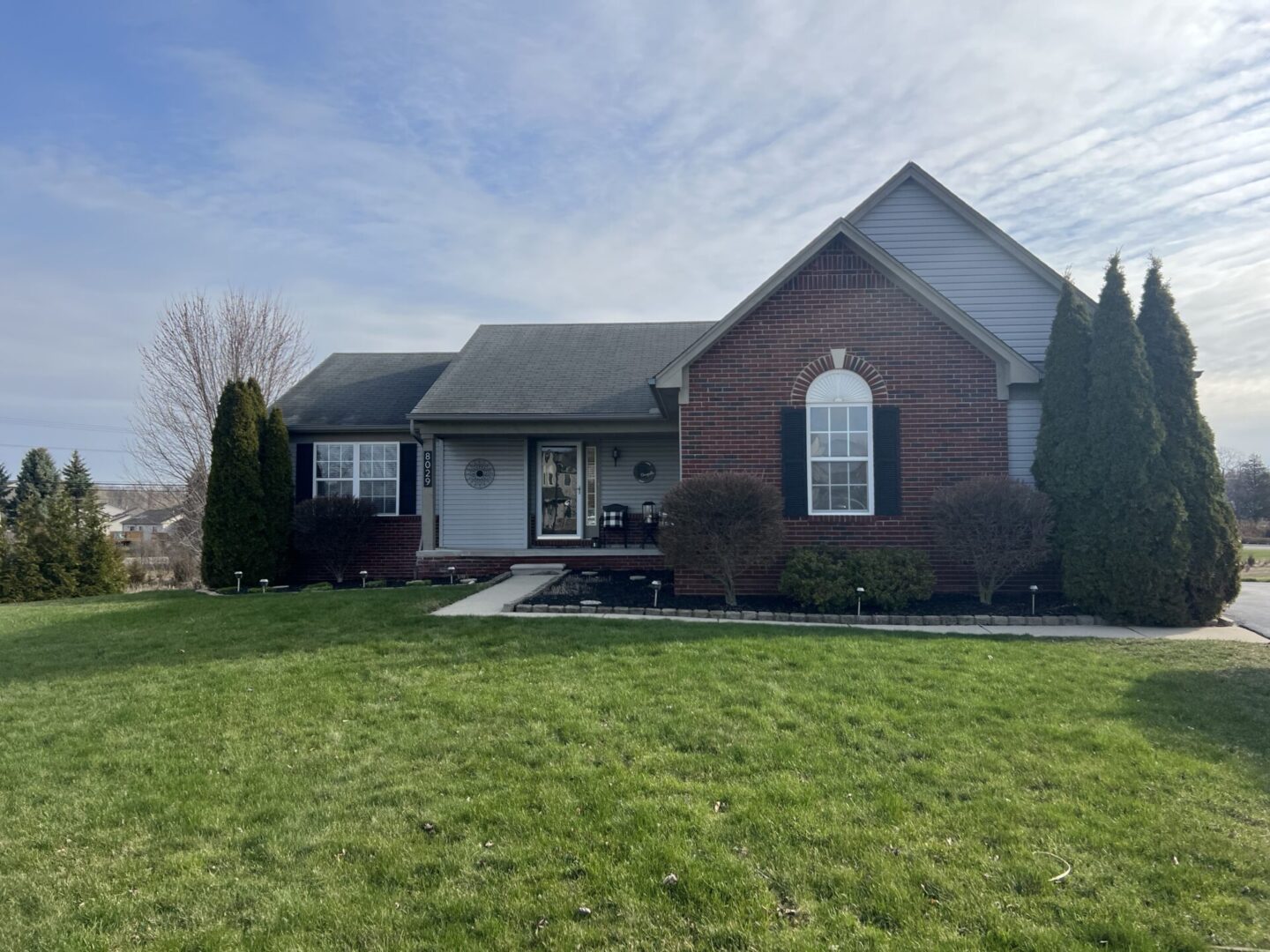 A single-story brick and siding house with a green lawn under a blue sky.