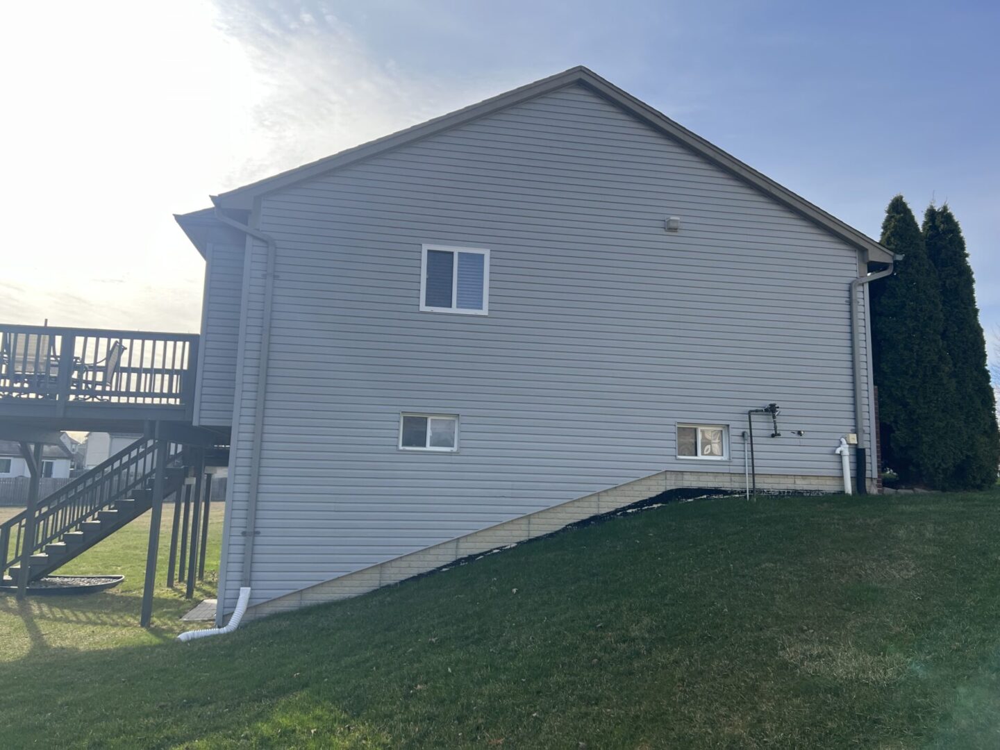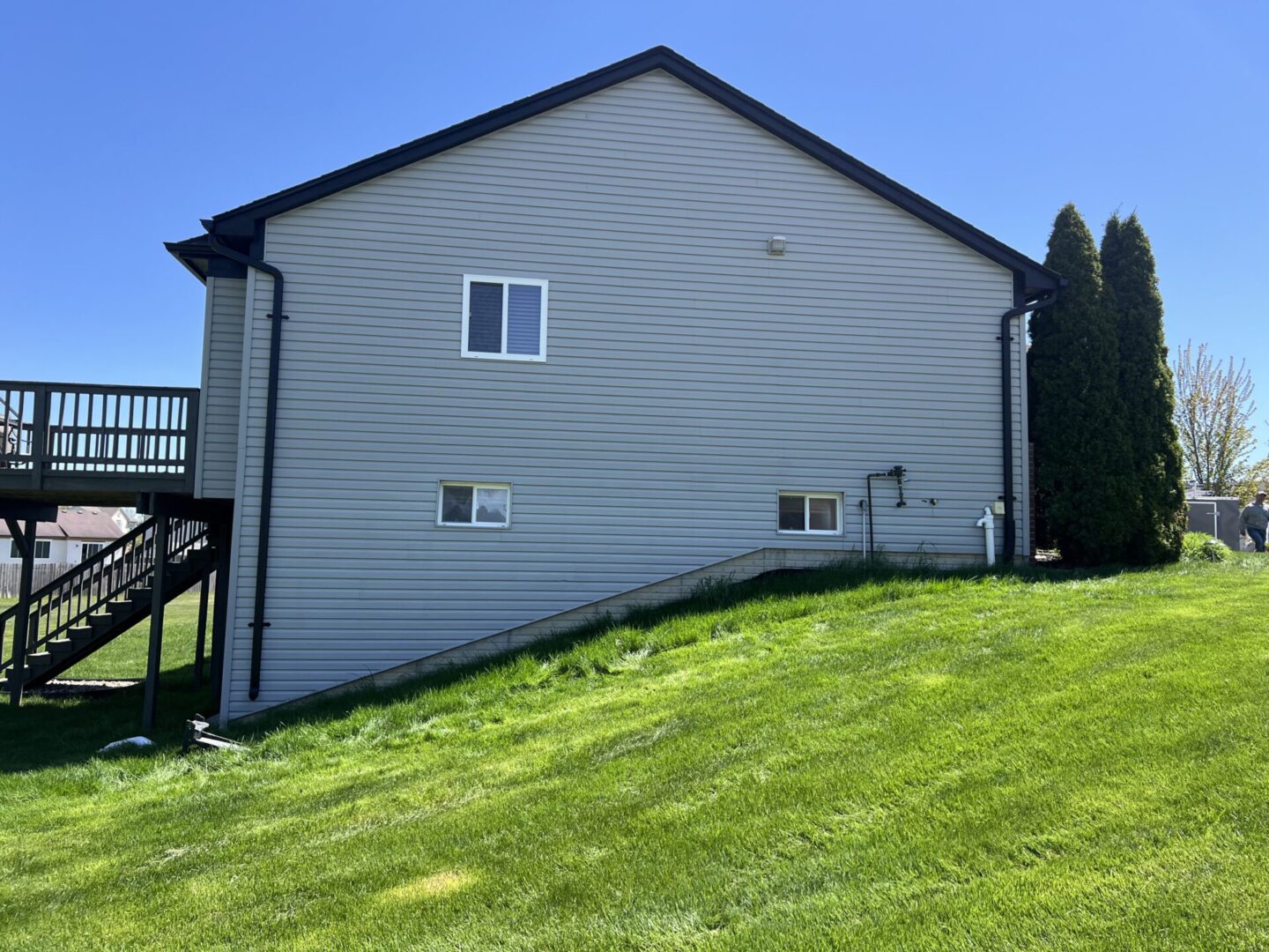Side view of a house with a sloping grassy yard and white siding.
