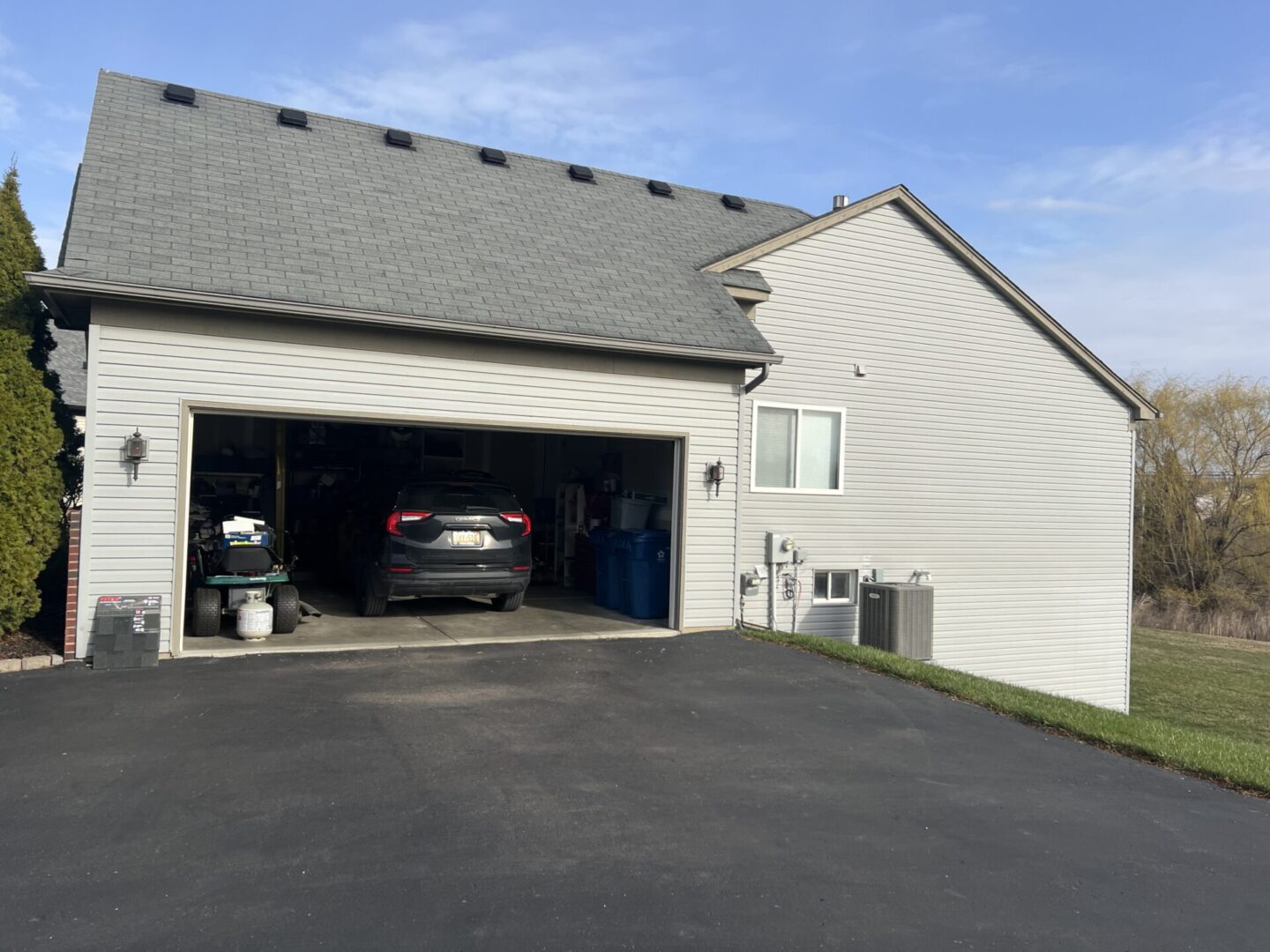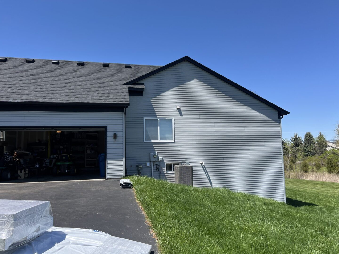 Gray house with a garage and green lawn under blue sky.