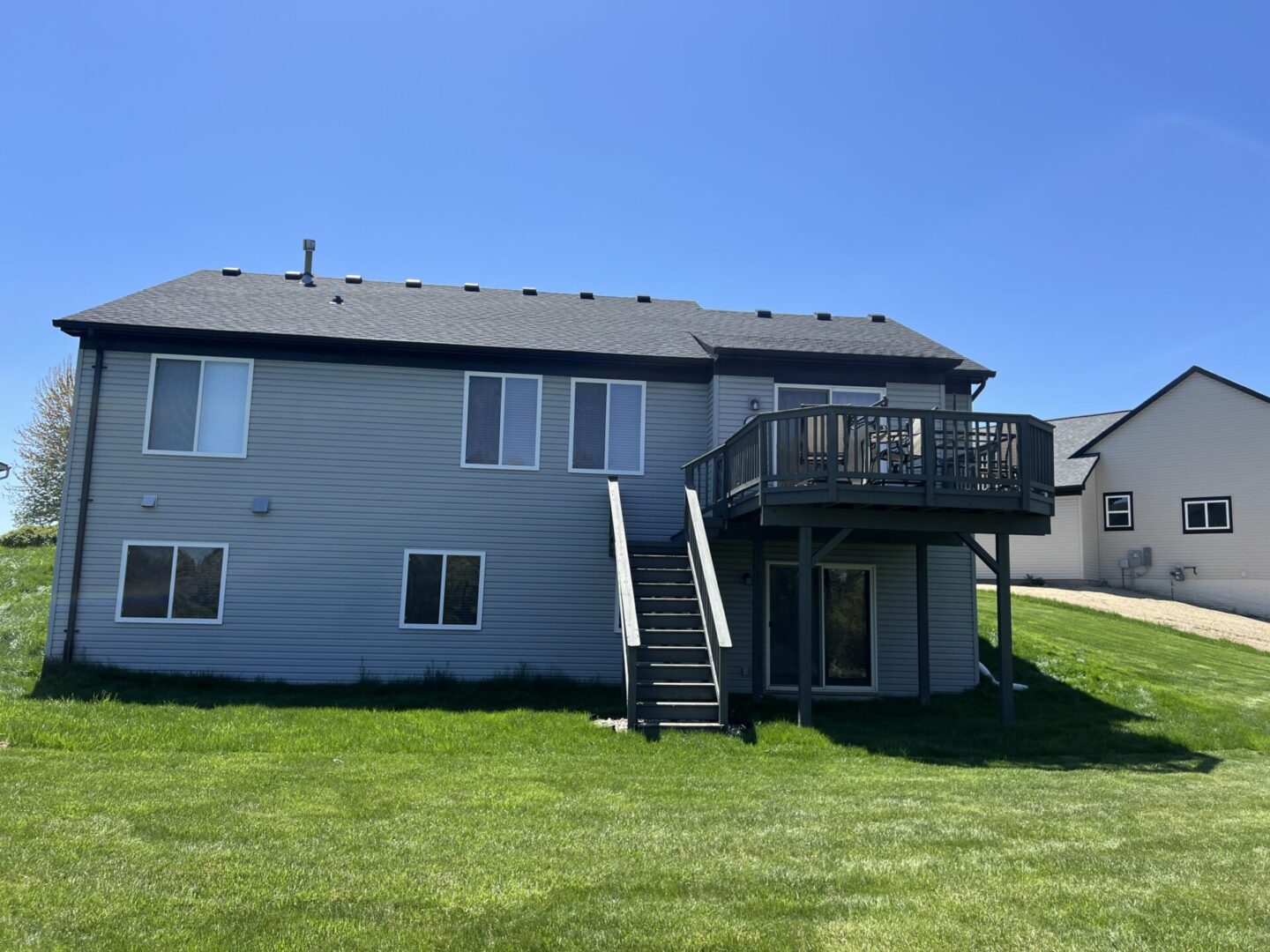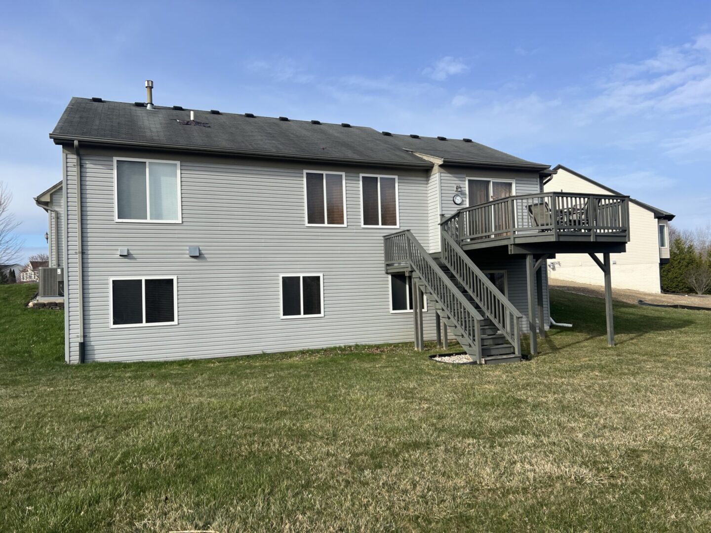 Back view of a two-story house with stairs leading to an elevated deck.