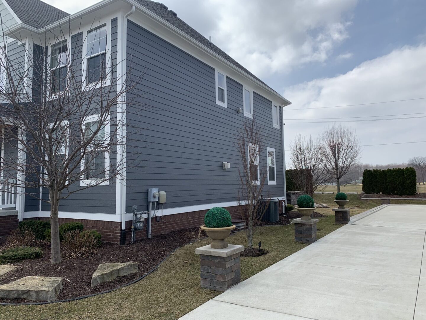 A gray two-story house with a well-kept yard and concrete walkway.