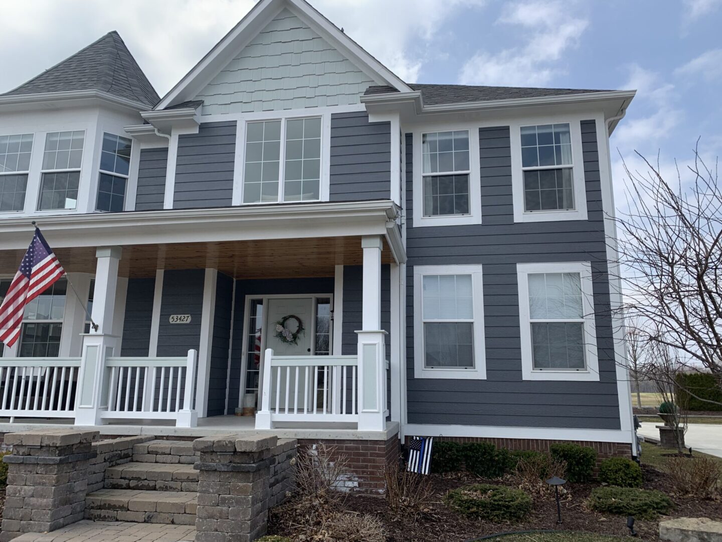 A two-story gray house with white trim and a welcoming front porch.
