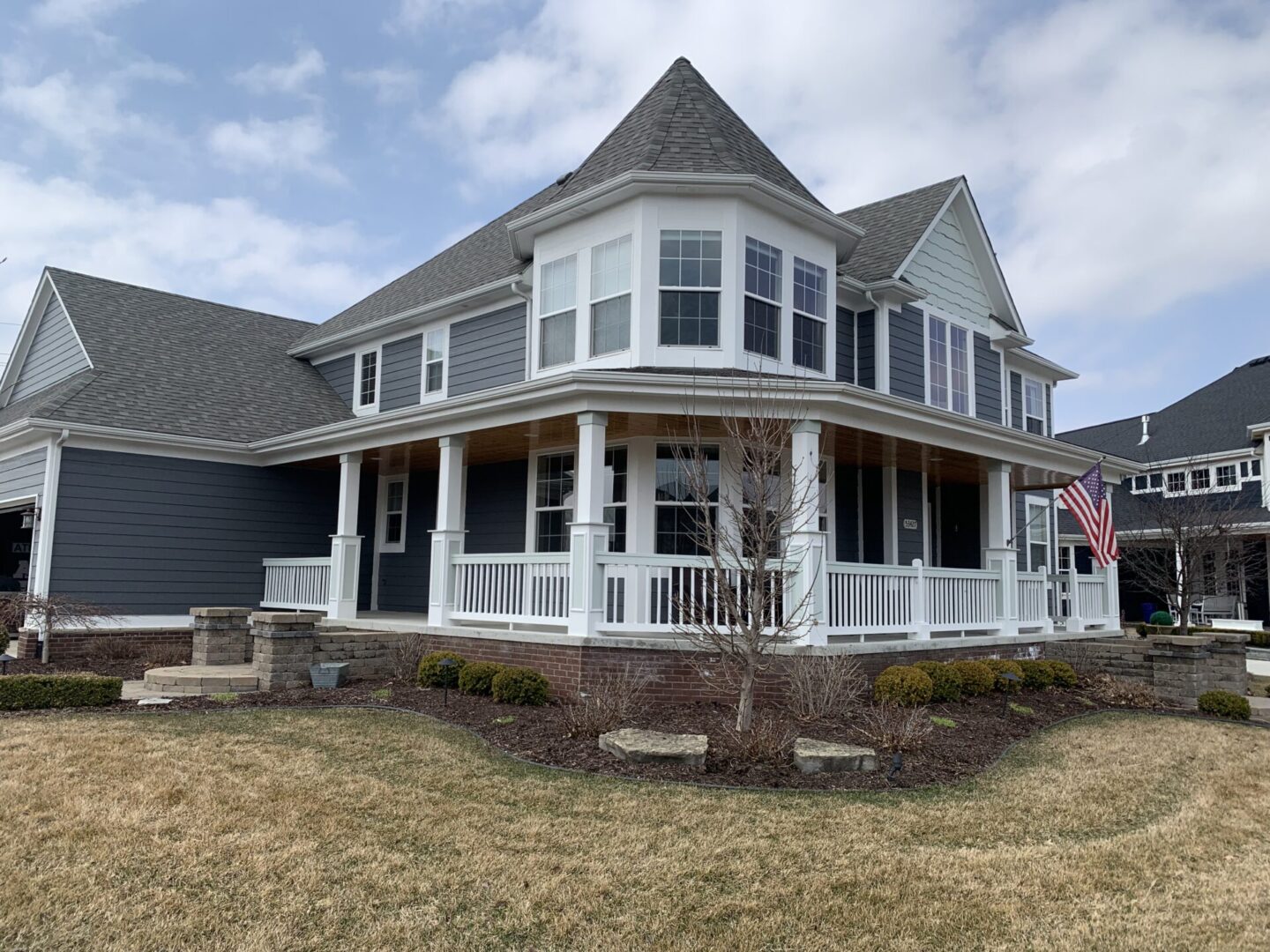 A charming two-story house with a wraparound porch and turret.
