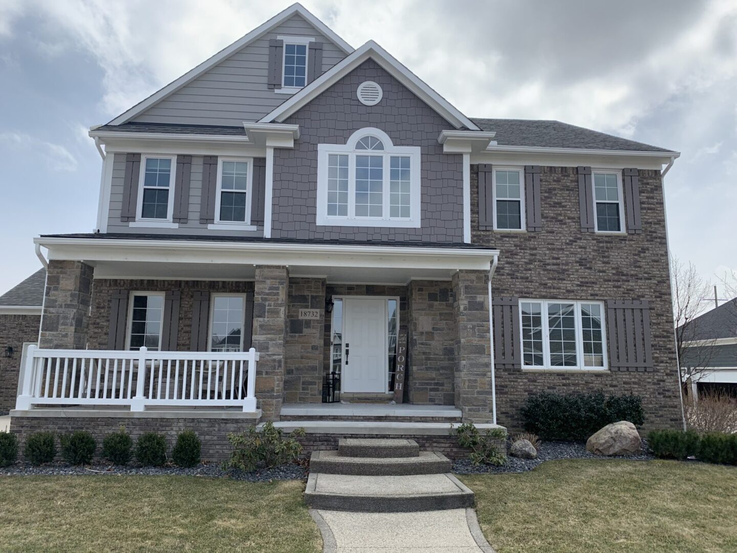 A modern two-story house with a stone facade and white trim.