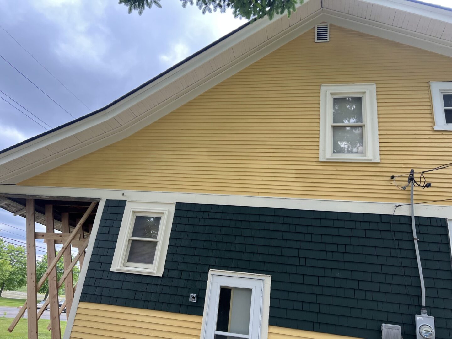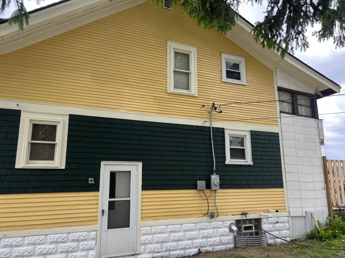 Two-tone house exterior with yellow upper and dark green lower walls under a cloudy sky.