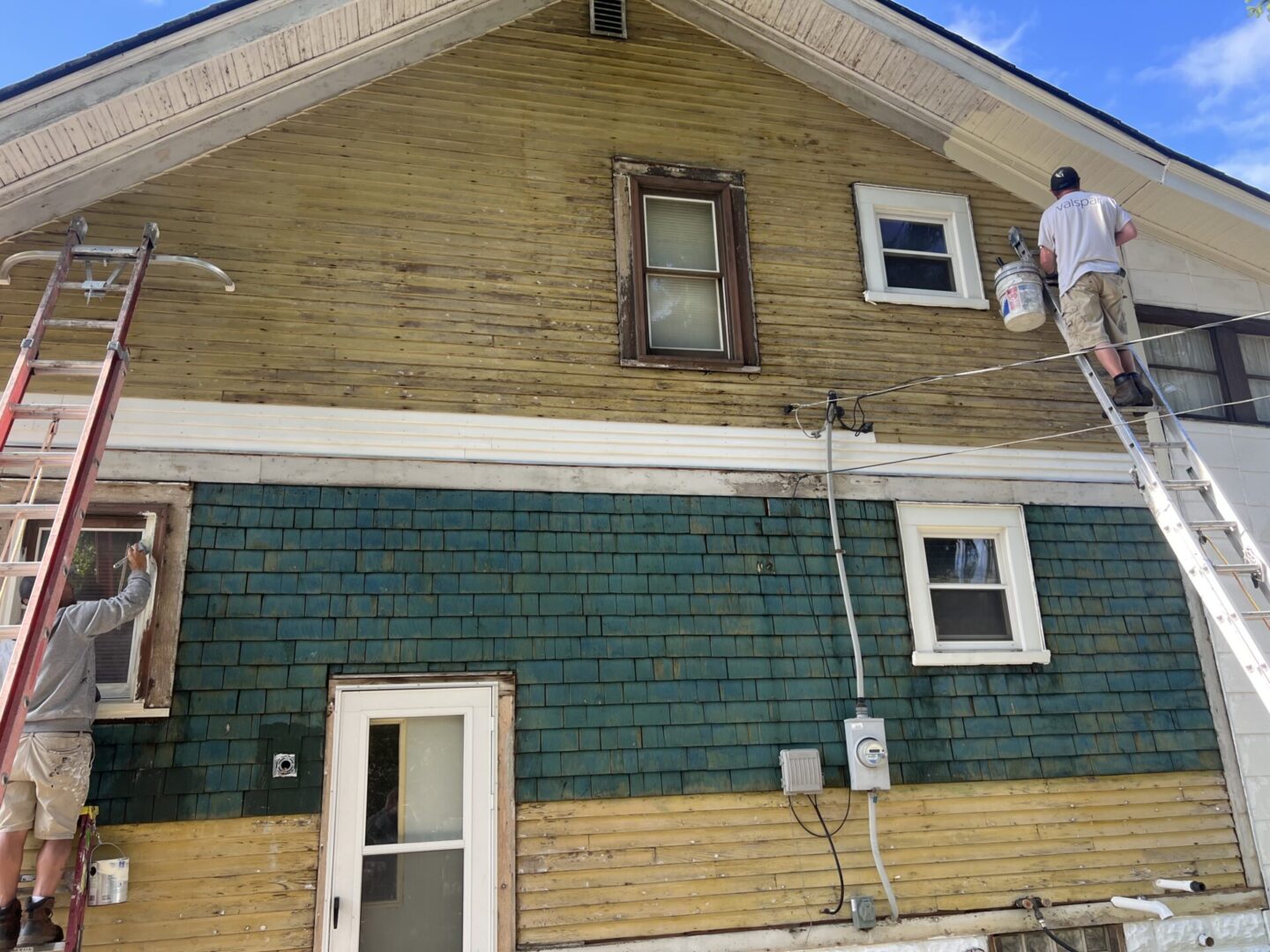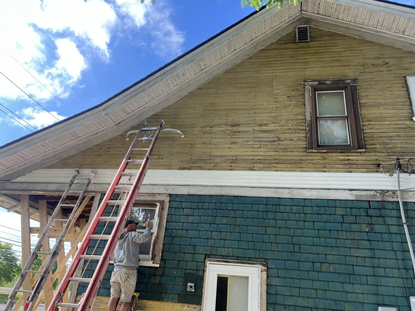 House exterior with green and yellow siding and a worker on a ladder.